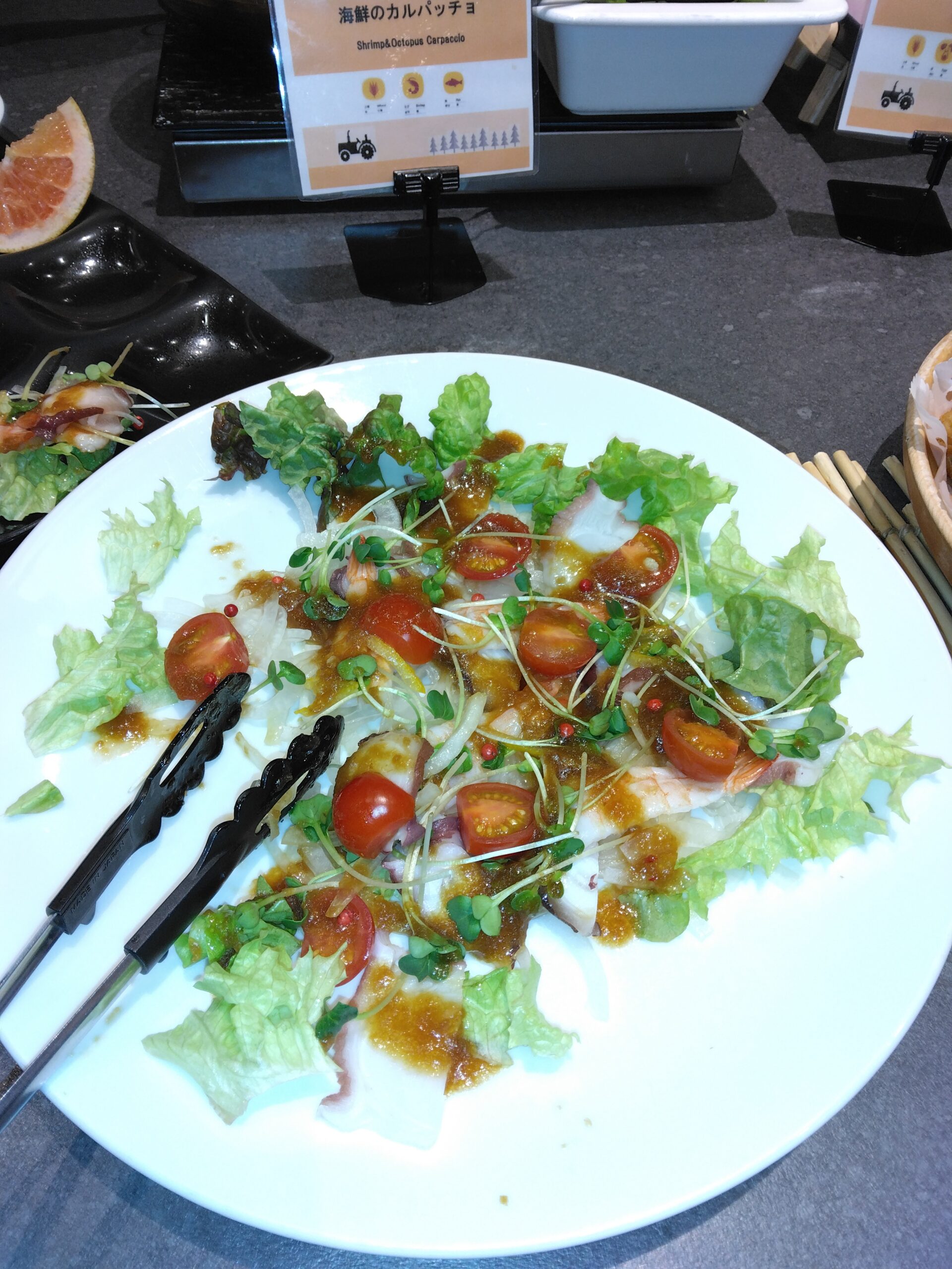 お刺身も新鮮で旨味があります。海鮮のカルパッチョはタコやエビなど彩豊で美味しかったです。こちらも何回もお代わりしました。