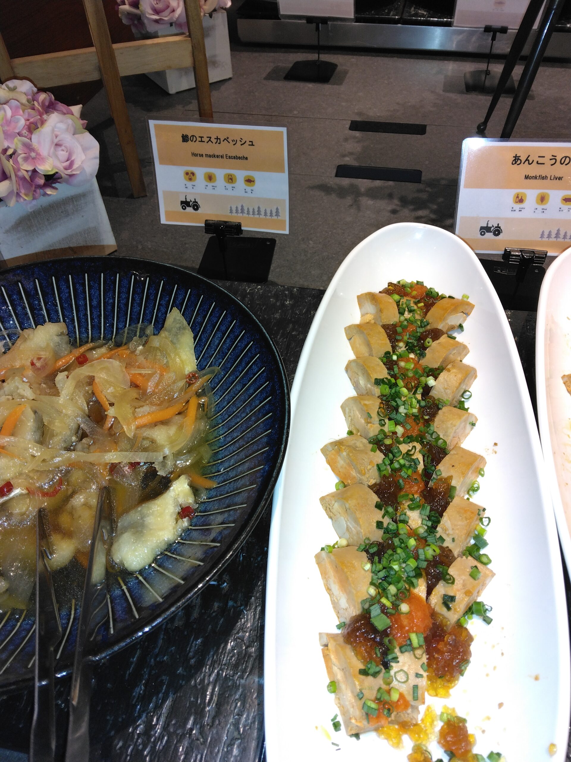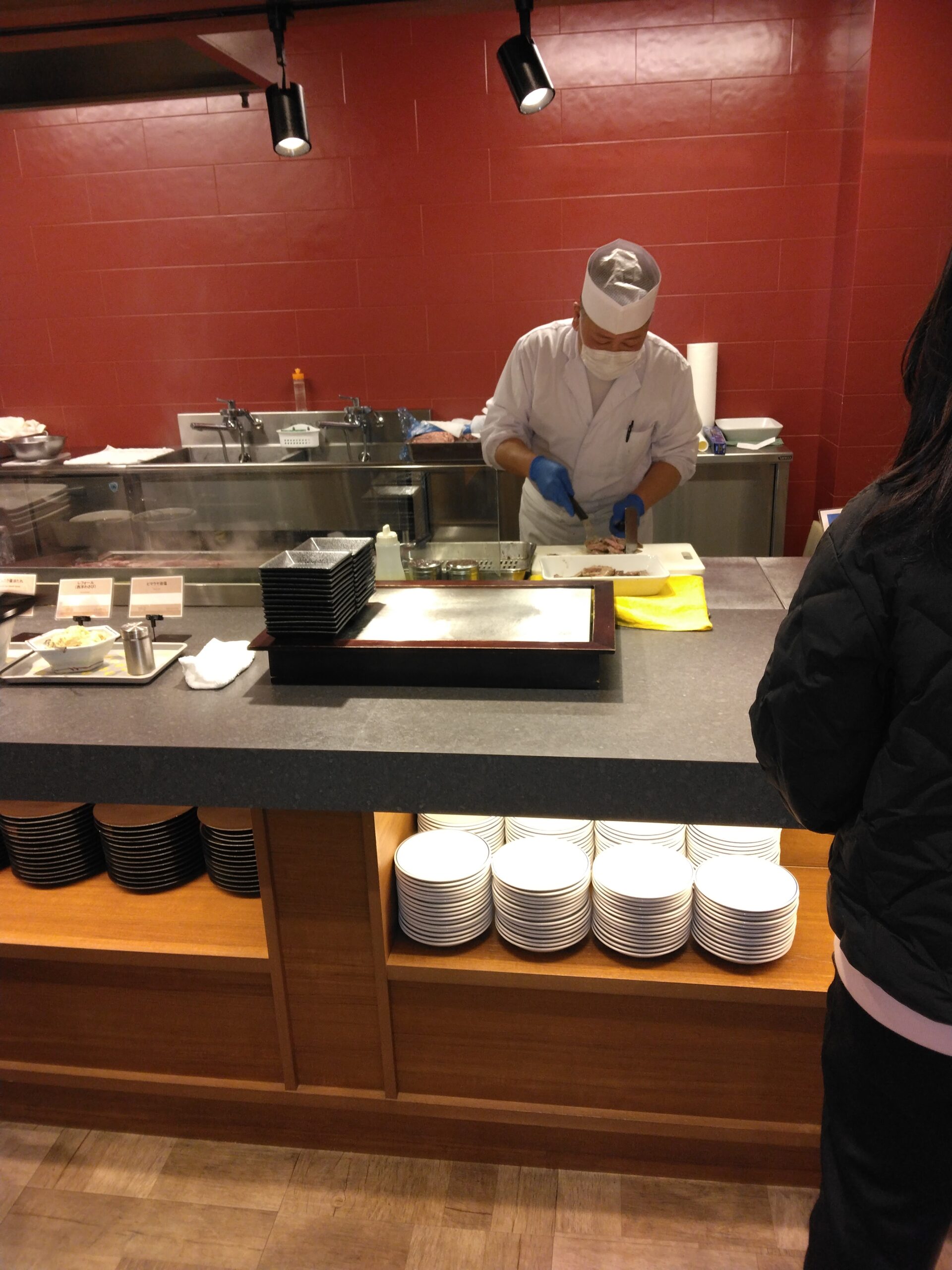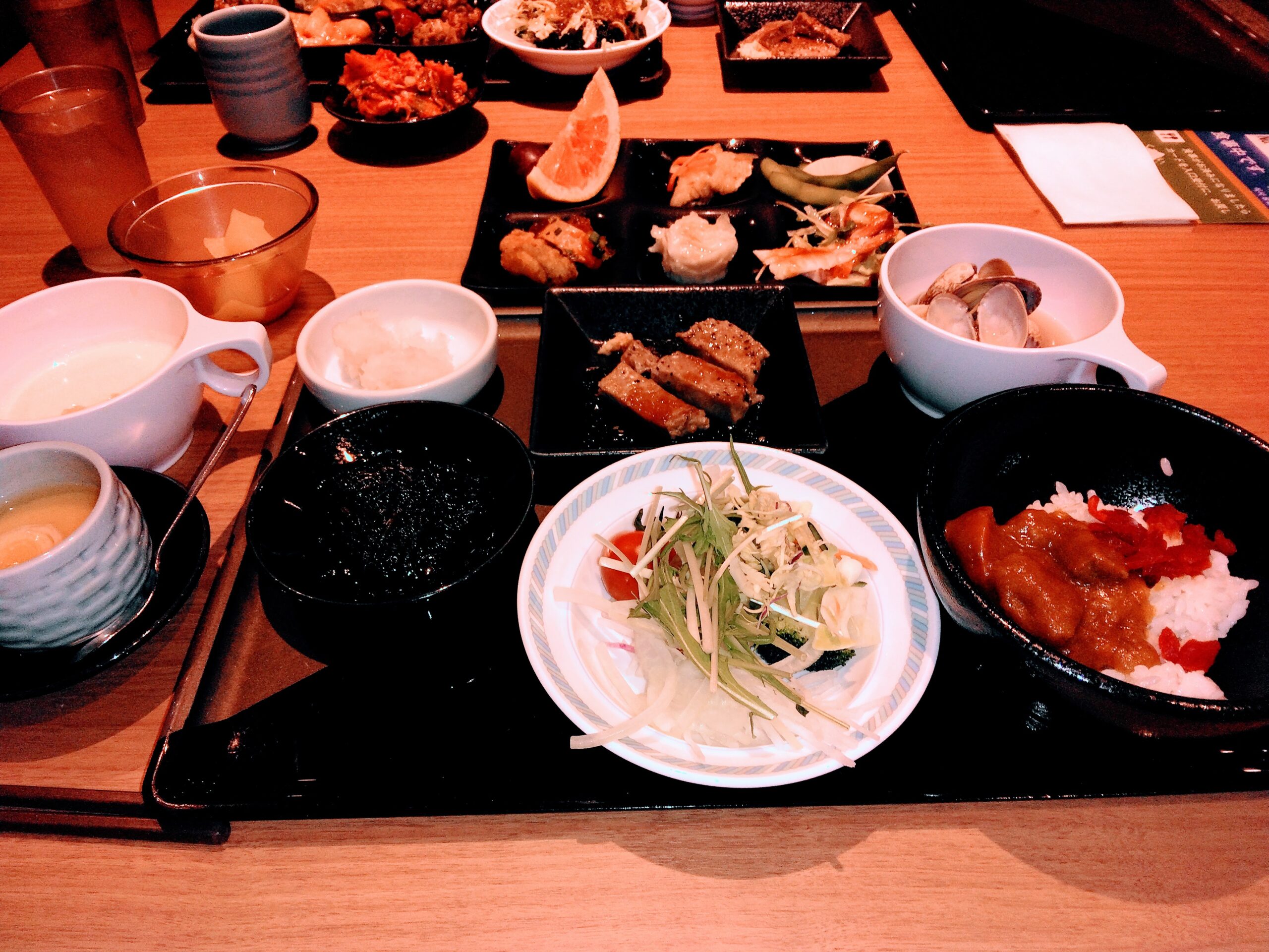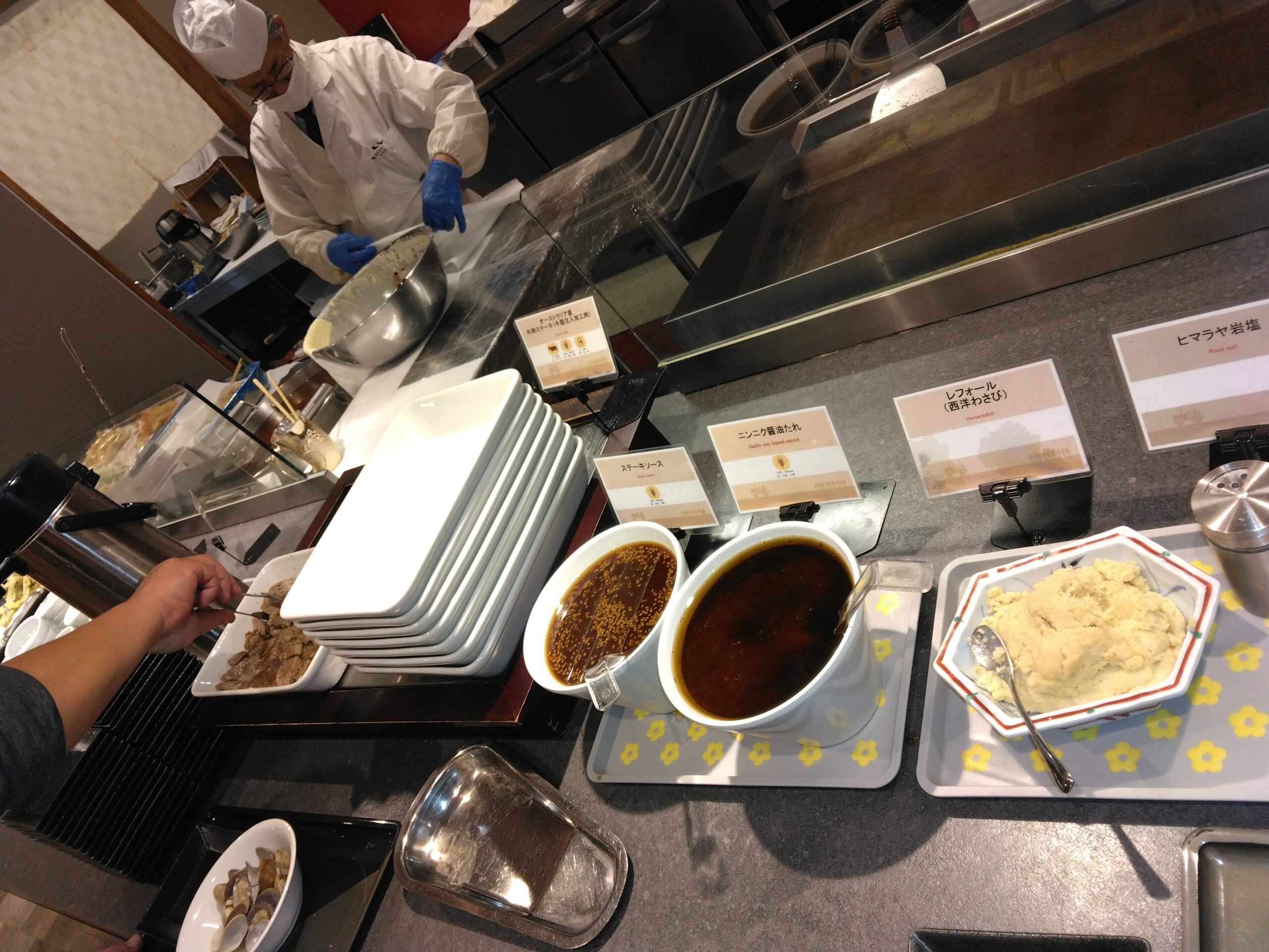 目でも楽しめるライブキッチンでは牛ステーキや揚げたて天ぷらなど、専門のシェフが目の前で料理してもらいアツアツのお料理をいただくことができました。