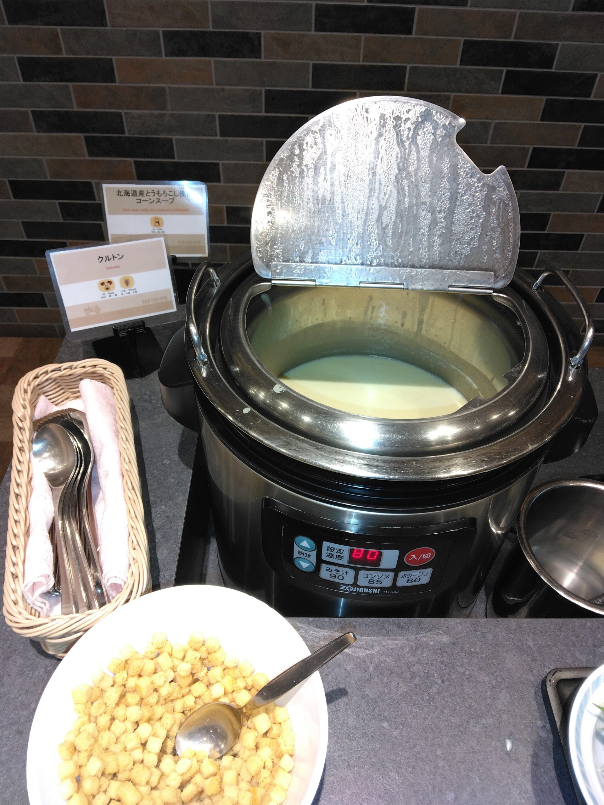 コーンスープは本場の北海道のトウモロコシを使用されており、濃厚でクリーミーです。こちらも何回もお代わりしました。