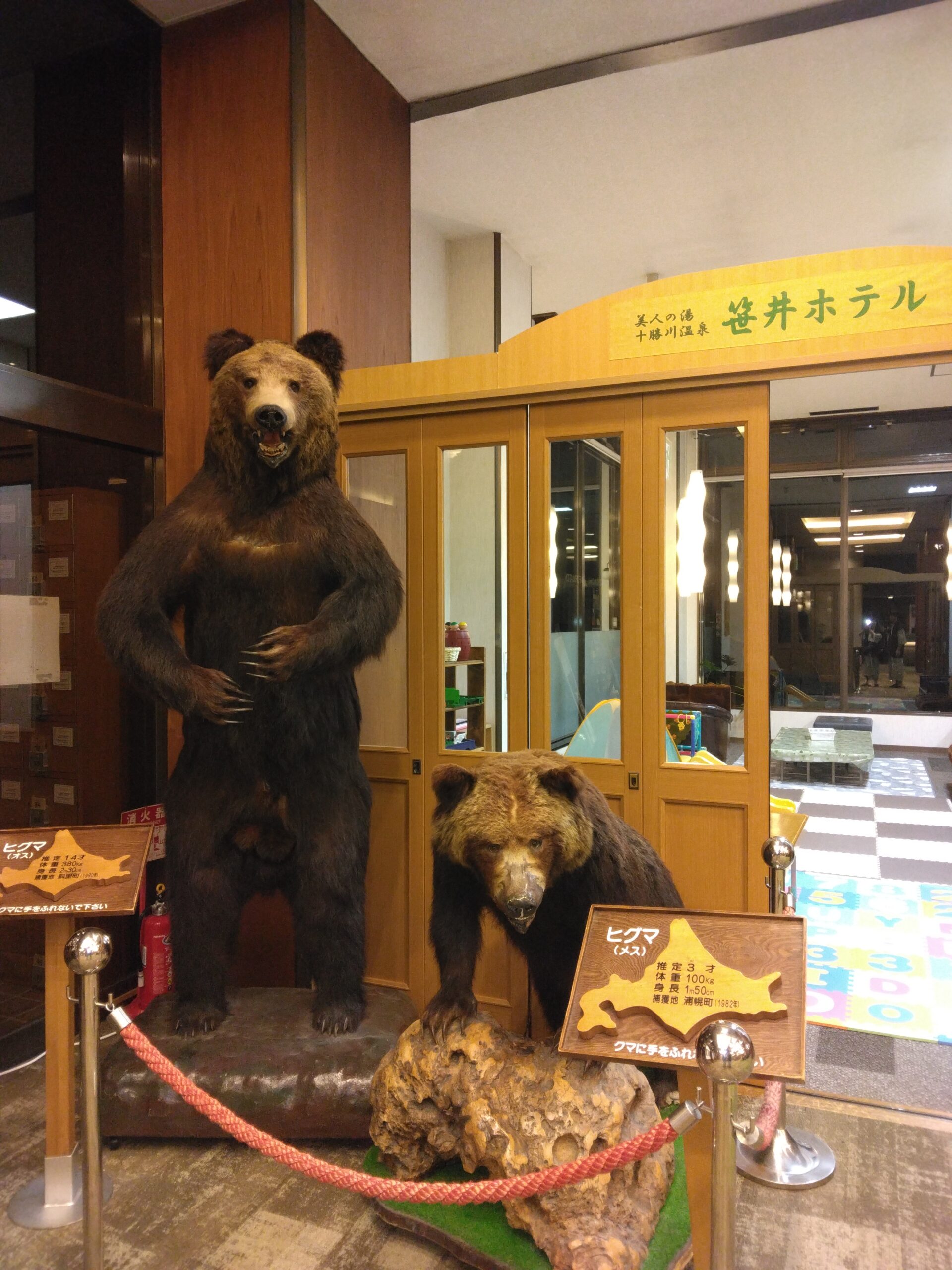 ホテルのロビーには大迫力のヒグマが!!剥製とは言えども、ものすごい迫力です。